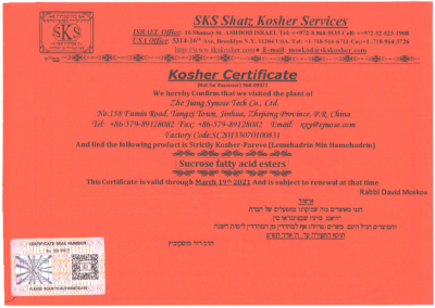 公司被評為“國家高新技術企業”,并有多個產品獲得“國內發明專利”,通過了FSSC22000食品安全體系認證,ISO14001環境管理體系,MUI HALAL認證,SKS KOSHER認證,ISO9001質量管理體系和ISO22000食品安全管理體系認證,并有多個產品通過了“歐洲REACH法規”注冊和“韓國REACH法規” 預注冊。